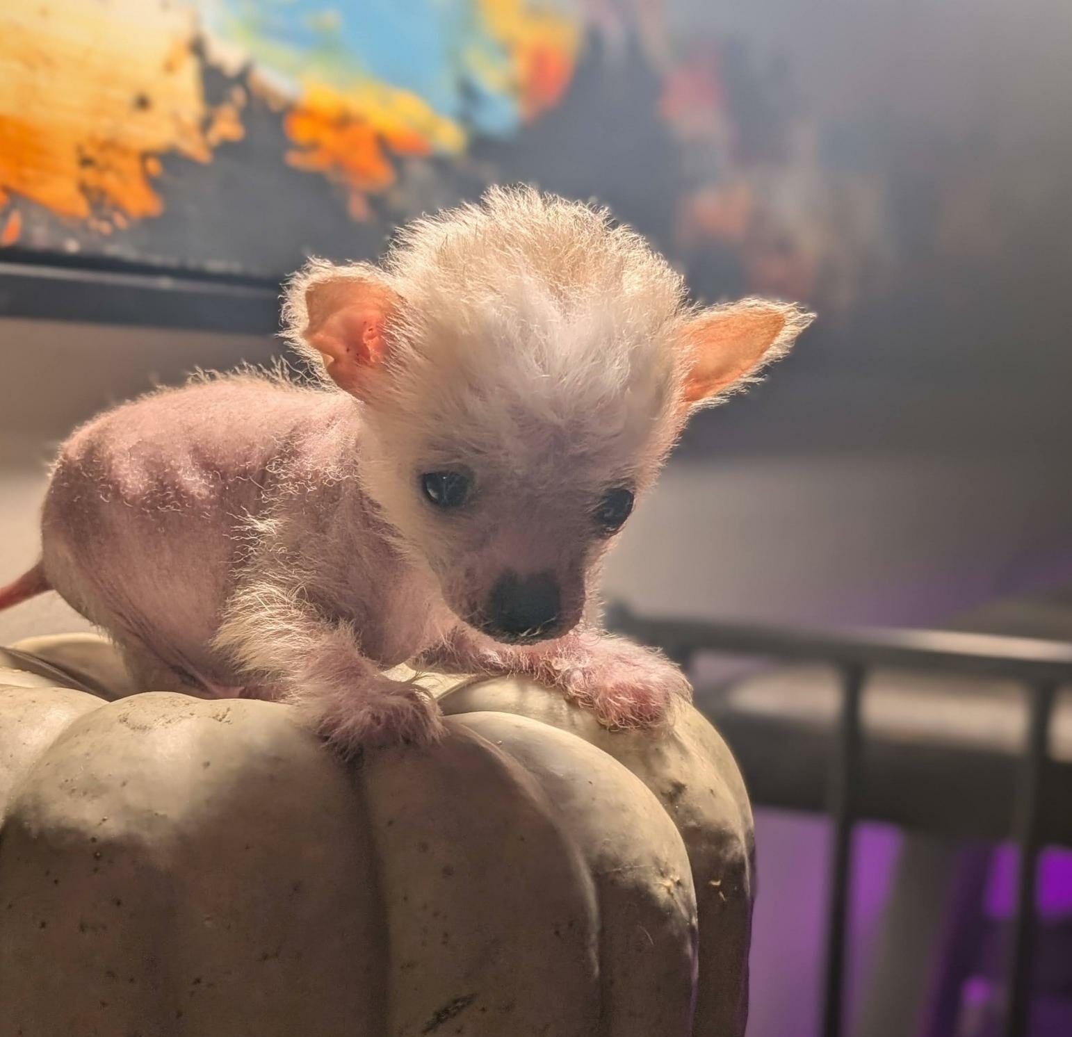 Say hello to Little Man, a one-of-a-kind hairless pup who’s small in size but huge in charm! With his smooth skin, expressive eyes, and irresistibly tiny frame, Little Man turns heads everywhere he goes. He’s confident, cuddly, and full of personality — the kind of little companion who’ll melt your heart the moment you meet him.